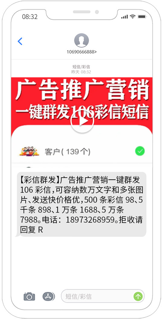 充值起點低、高性價比、按需付費、24小時發送、快速實現商用。未來已來,視頻短信群發業務喚醒無限商機,讓視頻短信群發帶著品牌飛。眾多企業的選擇,超億發送量,7*24小時服務支持。